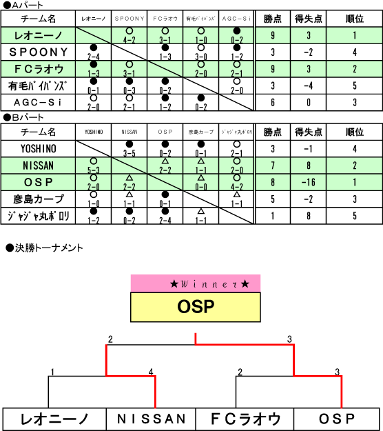 Bパートからは新顔2チーム、NISSANとOSPが共に勝点8で突破しました!!