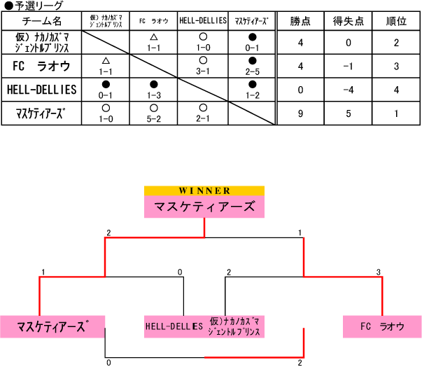 HELL-DELLIESさんはマスケティアーズさんのキーパーのファインセーブに攻撃を食い止められ、マスケティアーズさんが決勝へ。