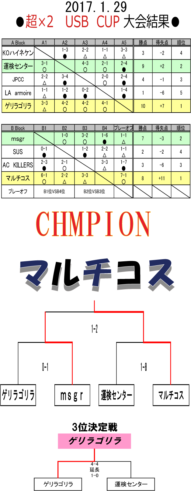 2017.1.29 超×2 USB CUP ■写真上 :優勝 マルチコス ■写真中 :準優勝 msgr ■写真下 :3位 ゲリラゴリラ 寒い中、たくさんのご参加ありがとうございました!