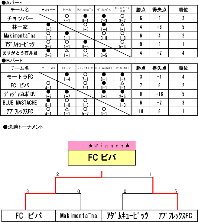 Bパートは優勝候補のアブフレックスが3勝1分で決勝トーナメント進出!続く2位にはFCビバが接戦をものにし、決勝トーナメントへ。。。