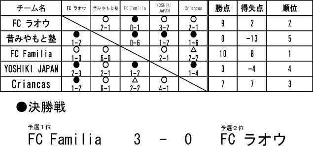 結果はFC Familiaが無敗で首位通過、1敗でFCラオウが2位となりました。