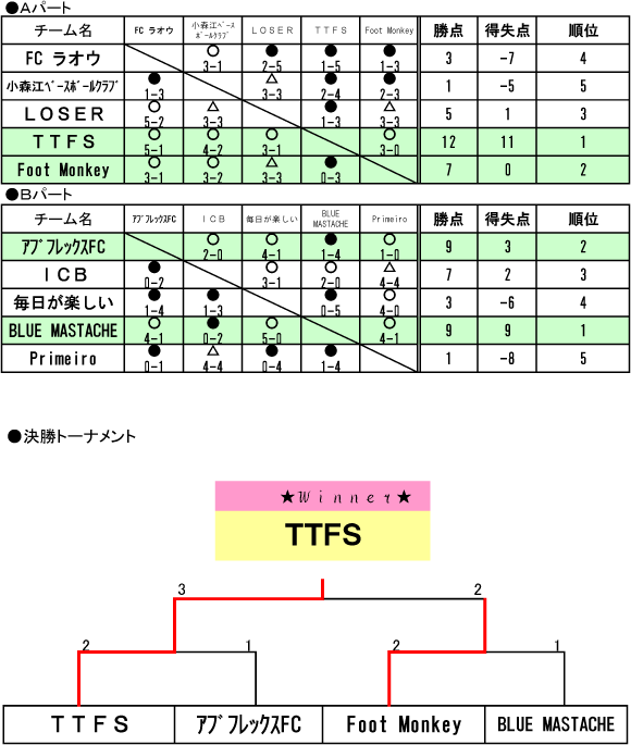 決勝は点の取り合いから始まり、最後はTTFSが3−2で粘るFoot Monkeyを振り切って初出場初優勝を飾りました!