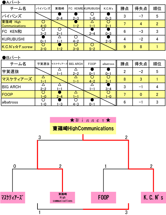 結果予選1位となったキンチャンズは予選2位の東篠崎に破れその東篠崎はFC KEN和に破れそのFC KEN和はKURUBUSHIに破れそのKURUBUSIはパイパンズに破れ・・・