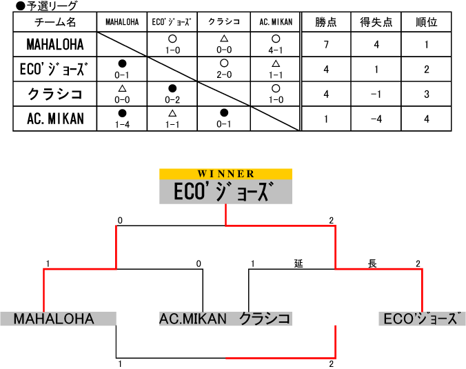 1位MAHALOHA 2位ECO'ジョーズ 3位クラシコ 4位AC.MIKAN となりました。