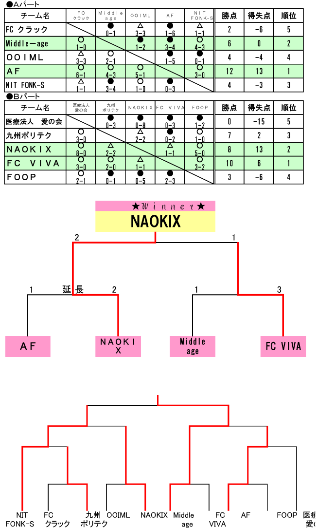 決勝トーナメントは【AF】VS【NAOKIX】、【FC VIVA】VS【Middle-age】となりました。
