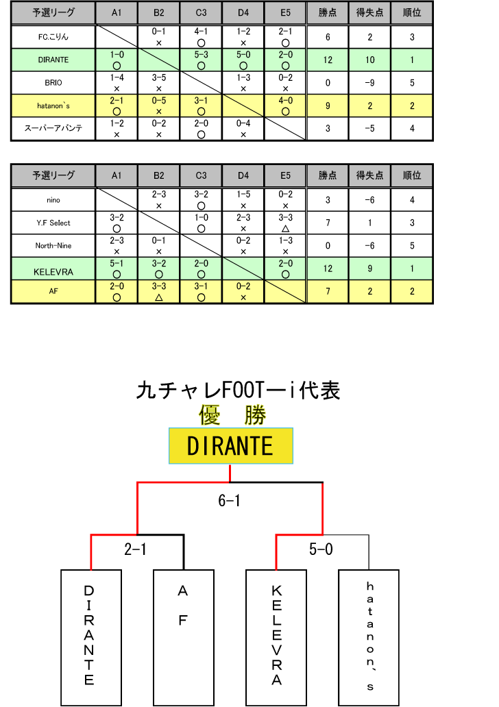 ○時間 10:00〜15:00 FOOT-i代表決定! ベスト4 Aブロック1位通過・・・『 DIRANTE 』 Bブロック1位通過・・・『 KELEVRA 』 Aブロック2位通過・・・『 hatanon's 』 Bブロック2位通過・・・『 A F 』