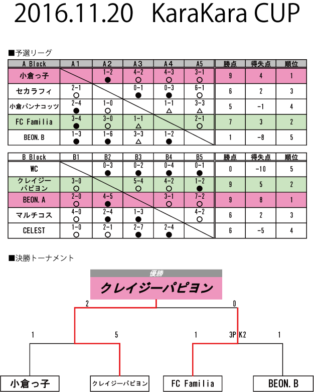 2016.11.20 KaraKara CUP ■写真上 :優勝 クレイジーパピヨン ■写真下 :準優勝 FC Familia たくさんのご参加ありがとうございました!