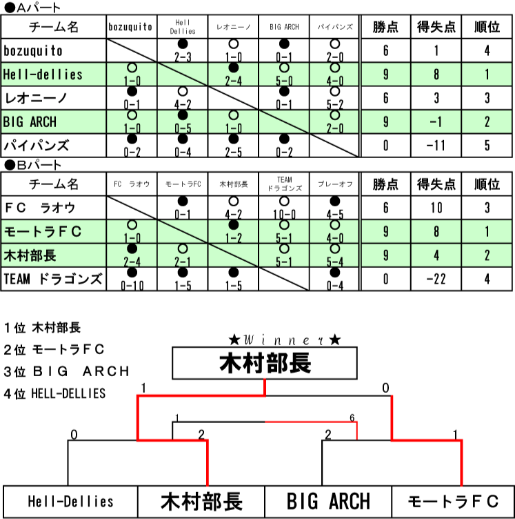 Bパートは1-4からの逆転で2位に食い込んだ木村部長と個人力に勝るモートラFCがお見事決勝トーナメント進出!