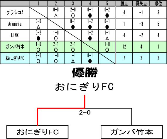 2015.7.20ソサイチCUP 【出場チーム一覧】 クラシコA Arancia LINX ガンバ竹本 おにぎりFC 【写真上】優勝おにぎりFC 【写真下】準優勝ガンバ竹本