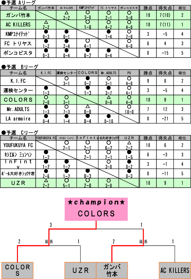 【写真上】優勝 COLORS 【写真中】2位 ガンバ竹本 【写真下】3位 UZR