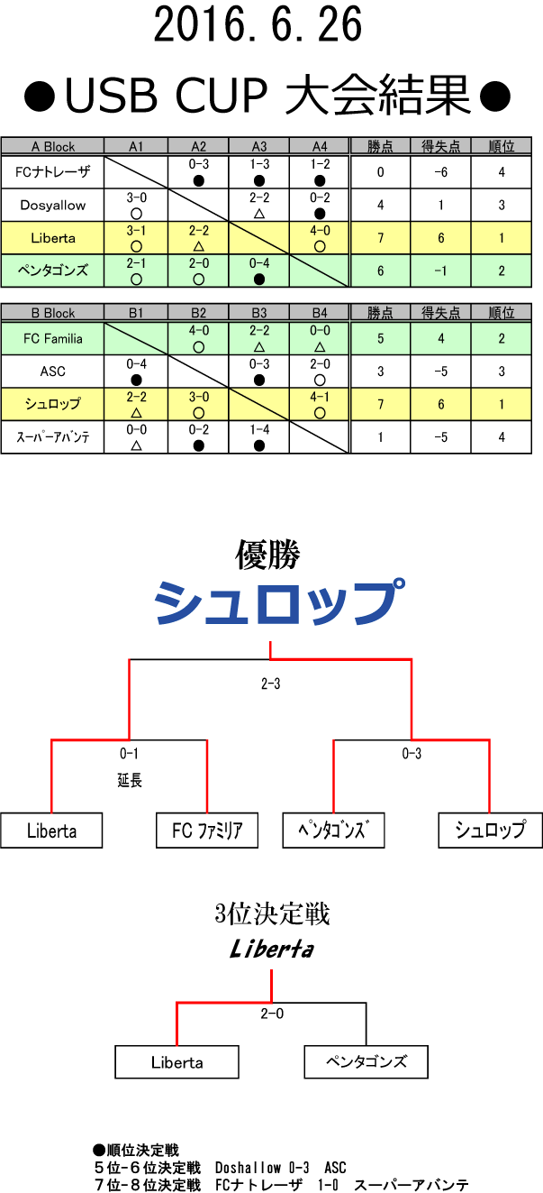 ■2016.6.26 USB CUP結果■ 優勝 シュロップ(写真上) 準優勝 FC ファミリア(写真中) 3位 Liberta(写真下)