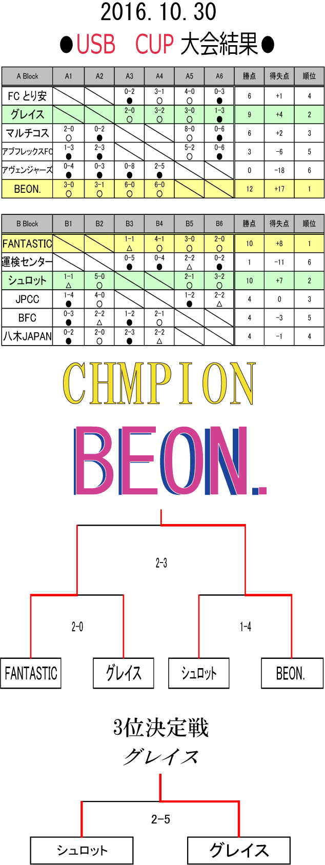 2016年9月25日 超×2 USB CUP 写真上【優勝 BEON.】 写真中【準優勝 FANTASTIC】 写真下【3位 グレイス】