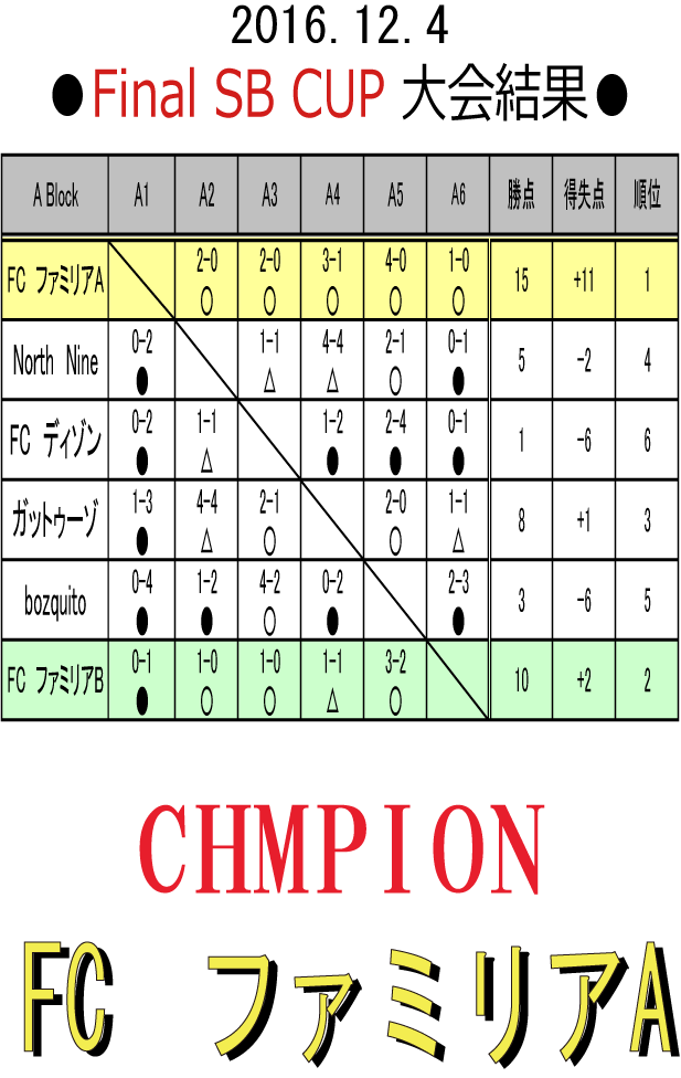 2016.12.11 Final SB CUP ■写真上 :優勝 FC ファミリアA ■写真中 :準優勝 FCファミリアB ■写真下 :3位 ガットゥーゾ 雨の中のご参加ありがとうございました!