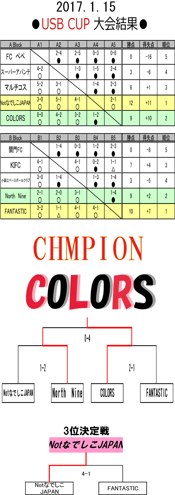 2017.1.15 USB CUP ■写真上 :優勝 COLORS ■写真中 :準優勝 North Nine ■写真下 :3位 NotなでしこJAPAN 寒い中、たくさんのご参加ありがとうございました!