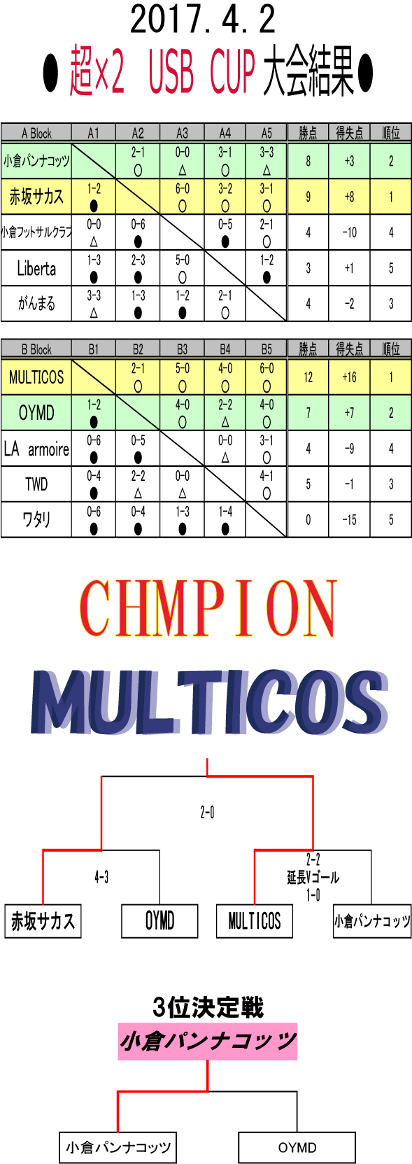 2017.4.2 超×2 USB CUP ■優勝 MULTICOS ■準優勝 赤坂サカス ■3位 小倉パンナコッツ 雨の降る中たくさんのご参加ありがとうございました!