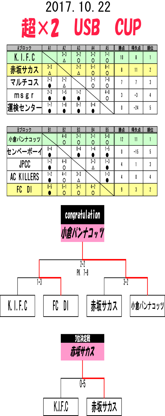 2017.10.22 超×2 USB CUP ■優勝 小倉パンナコッツ ■準優勝 FC DI ■3位 赤坂サカス ■4位 K.I.F.C 沢山のご参加ありがとうございました