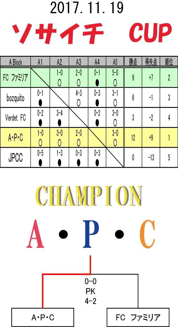 2017.11.19 ソサイチ CUP ■優勝 A・P・C ■準優勝 FC ファミリア 寒い中ご参加ありがとうございました。
