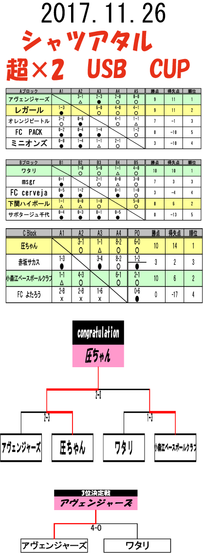 2017.10.22 超×2 USB CUP ■優勝 圧ちゃん ■準優勝 小森江ベースボールクラブ ■3位 アヴェベンジャーズ ■4位 ワタリ ■抽選会 当選チーム FC PACK 沢山のご参加ありがとうございました