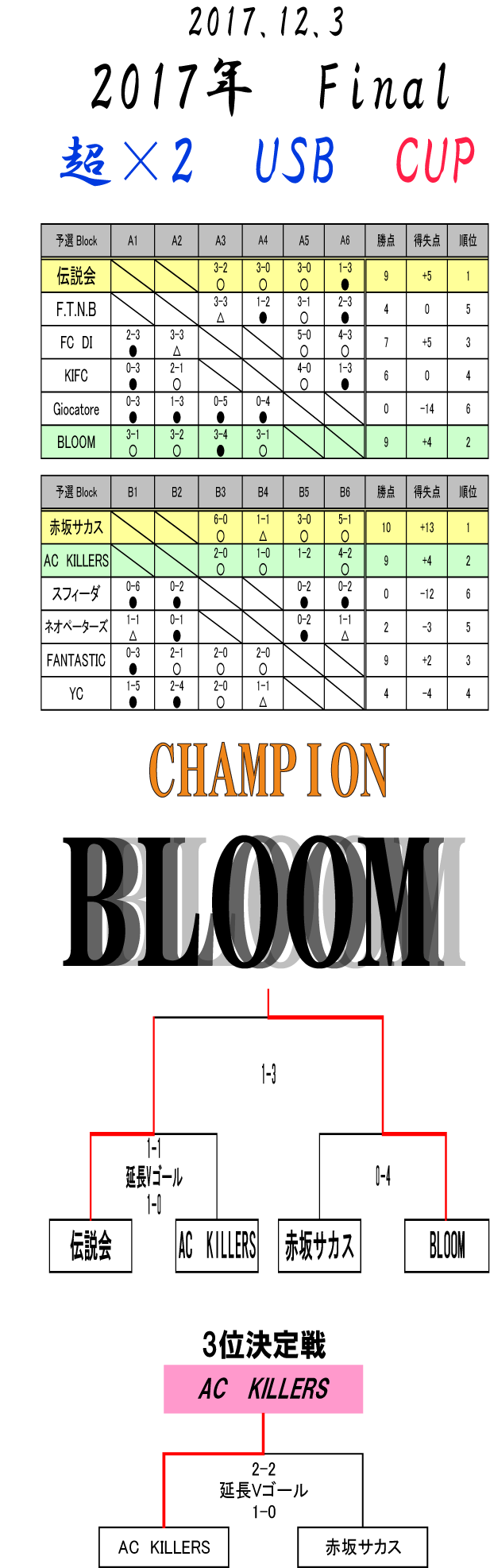 2017 Final 超×2 USB CUP ■写真上 優勝 BLOOM ■準優勝 伝説会 ■写真中 3位 AC KILLERS ■写真下 4位 赤坂サカス 2017年も沢山のご参加ありがとうございました。来年もヨロシクお願い致します!!!