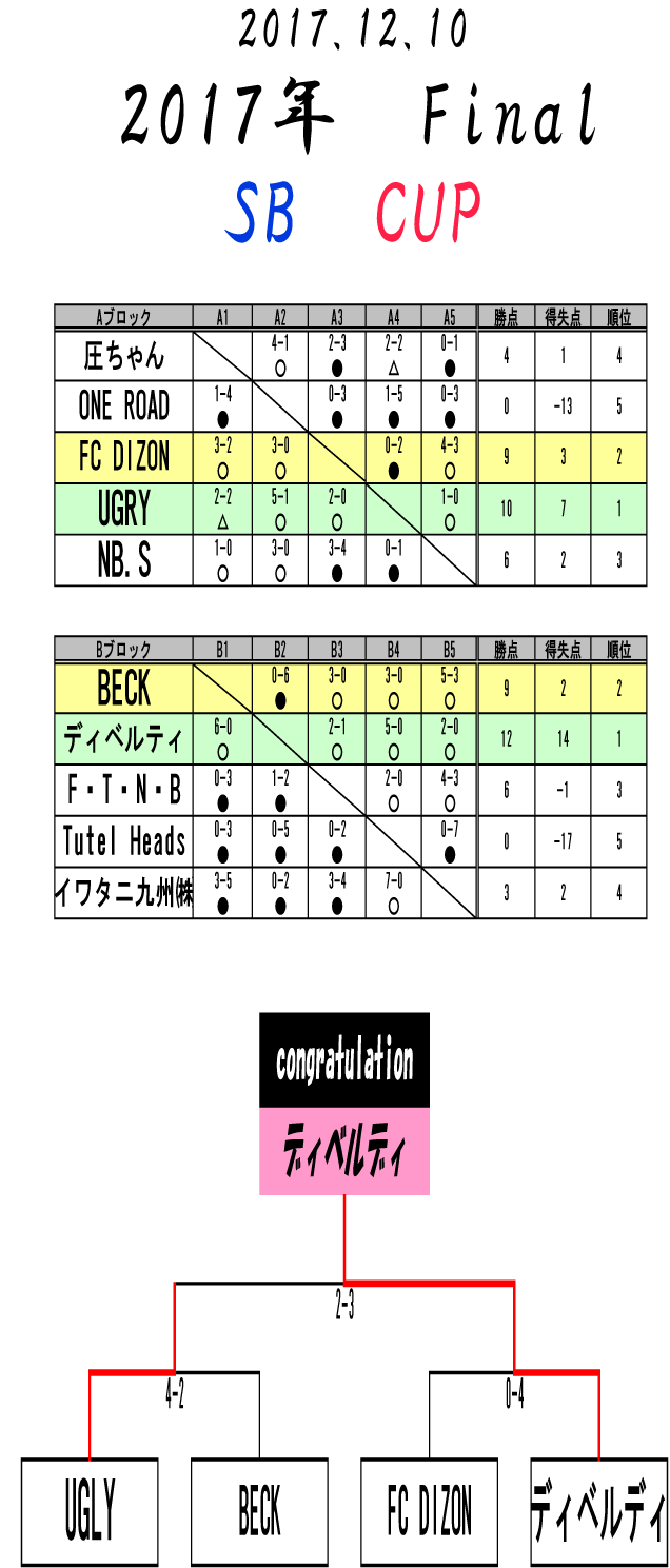 2017 Final SB CUP ■優勝 ディベルティ ■準優勝 UGLY ■3位 BECK ■4位 FC DIZON 2017年も沢山のご参加ありがとうございました。来年もヨロシクお願い致します