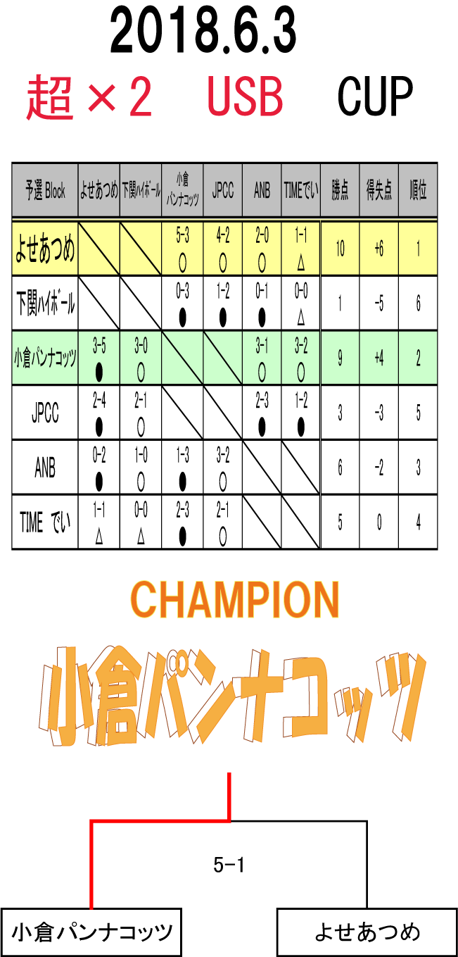 超×2 USB CUP 大会結果 ■写真上 優勝 小倉パンナコッツ ■写真中 準優勝 よせあつめ 暑い中ご参加ありがとうございました!