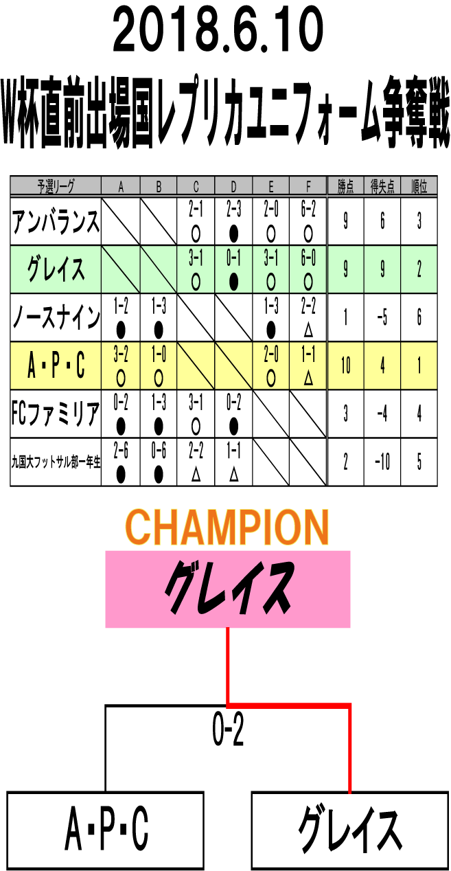 W杯直前出場国レプリカユニフォーム争奪戦 大会結果 ■優勝 グレイス ■準優勝 A・P・C 暑い中ご参加ありがとうございました!