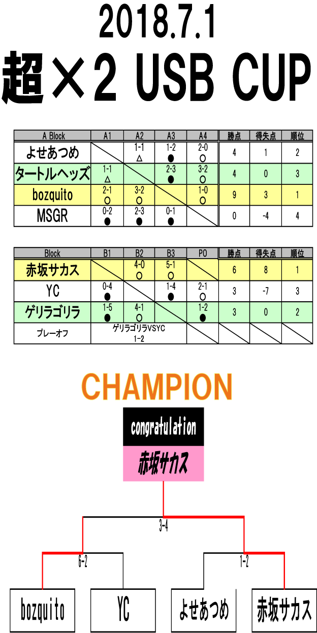 USB CUP 大会結果 ■優勝 赤坂サカス ■準優勝 bozquito 暑い中ご参加ありがとうございました!
