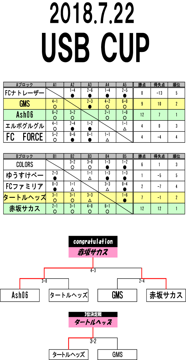 USB CUP 大会結果 ■優勝 Ash06 ■準優勝 赤坂サカス ■3位 タートルヘッズ ■4位 GMS 暑い中ご参加ありがとうございました!