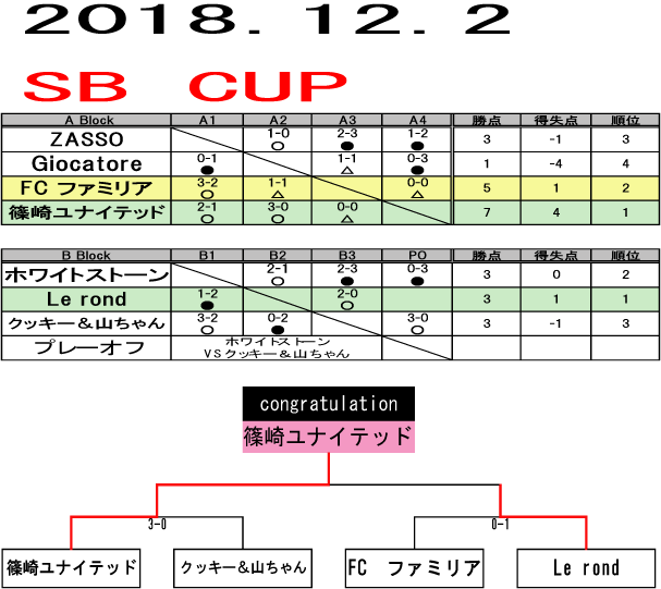 2018 FINAL SB CUP 大会結果 ■優勝 篠崎ユナイテッド ■準優勝 Le rond ■3位 FC ファミリア ■4位 クッキー&山ちゃん