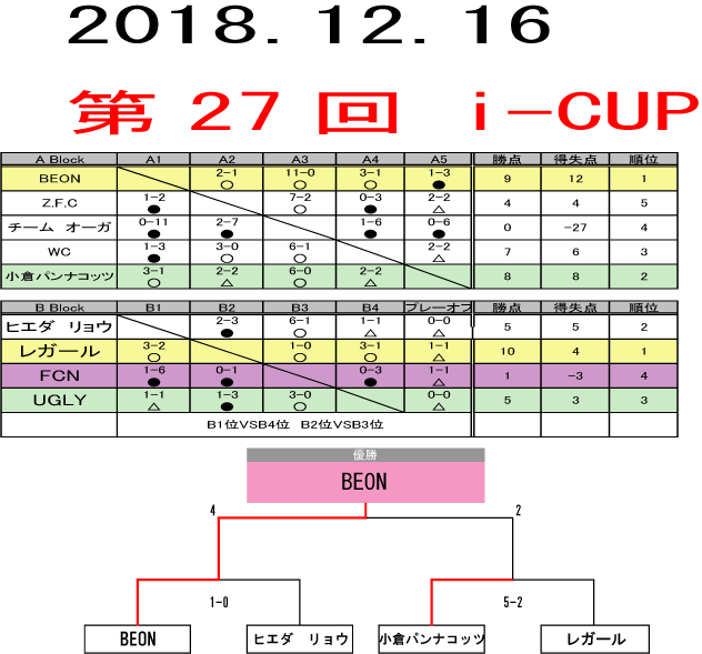 第27回 i-CUP 大会結果 ■優勝 BEON ■準優勝 小倉パンナコッツ ■3位 レガール ■4位 ヒエダ リョウ
