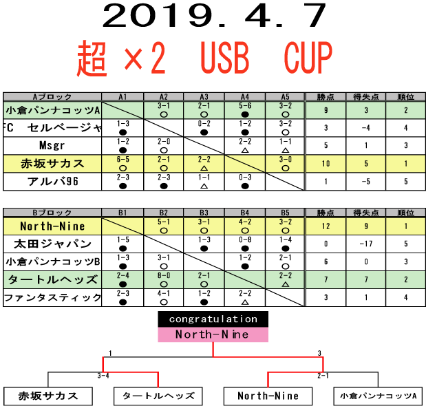 超×2 USB CUP 大会結果 ■優勝 North-Nine ■準優勝 タートルヘッズ ■三位 小倉パンナコッツA ■四位 赤坂サカス