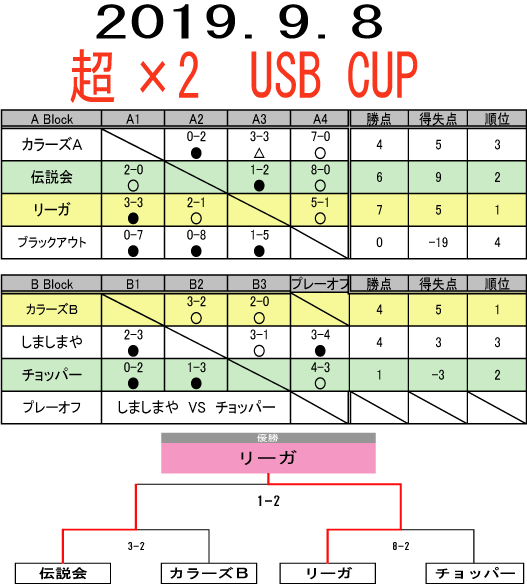 超×2 USB CUP 大会結果 ■優勝 リーガ ■準優勝 伝説会 ■三位 カラーズB ■四位 チョッパー