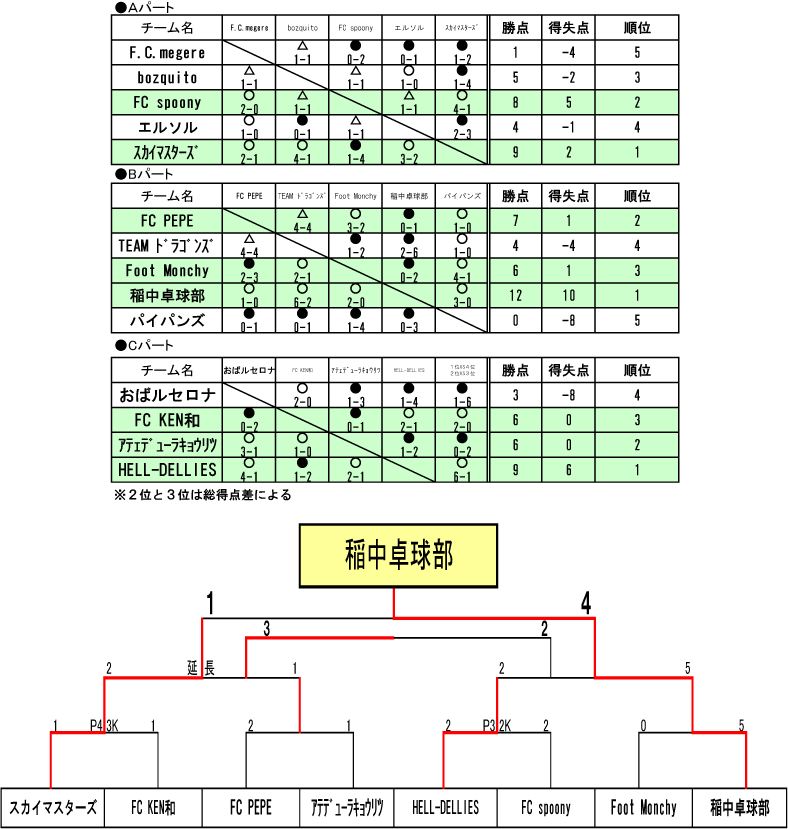 10試合中引分3試合、1点差4試合と熱戦となりました!勝利を手にした「スカイマスターズ」と無敗の「FC spoony」が勝ち抜け!